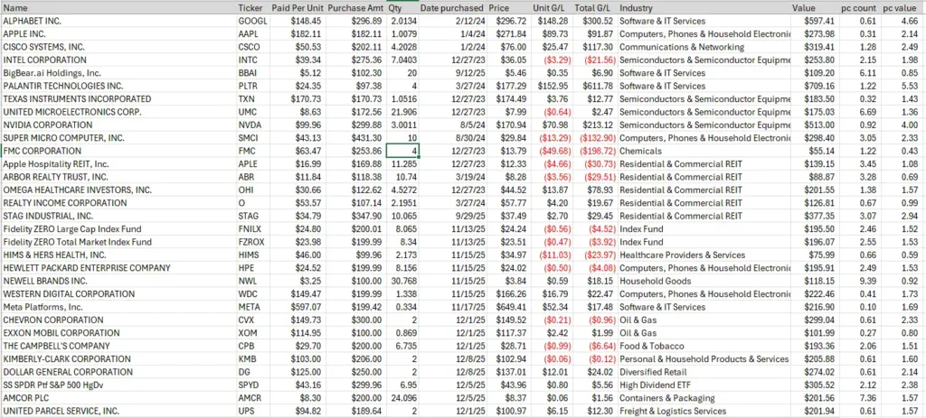 The image above is one of my spreadsheets that shows some of the stock positions and the price I paid with the price they are when I opened the spreadsheet. I only have a couple of index funds and one ETF in my mix at the moment. It is my philosophy that there are no bad stocks, but sometimes you just buy them at the wrong time! I did that on a couple as you might be able to tell. That’s why someone will tell you that they had great success with a stock and when you buy it, well… It just becomes a nightmare. They bought it at the right time but by the time you heard about it, it was the wrong time!